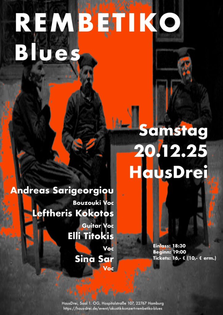 „REMBETIKO Blues“ bringt den Klang der griechischen Subkultur auf die Bühne. Am 20. Dezember könnt ihr im HausDrei in die Welt dieser einzigartigen Musik eintauchen – zwischen Tradition, Melancholie und Lebensfreude.