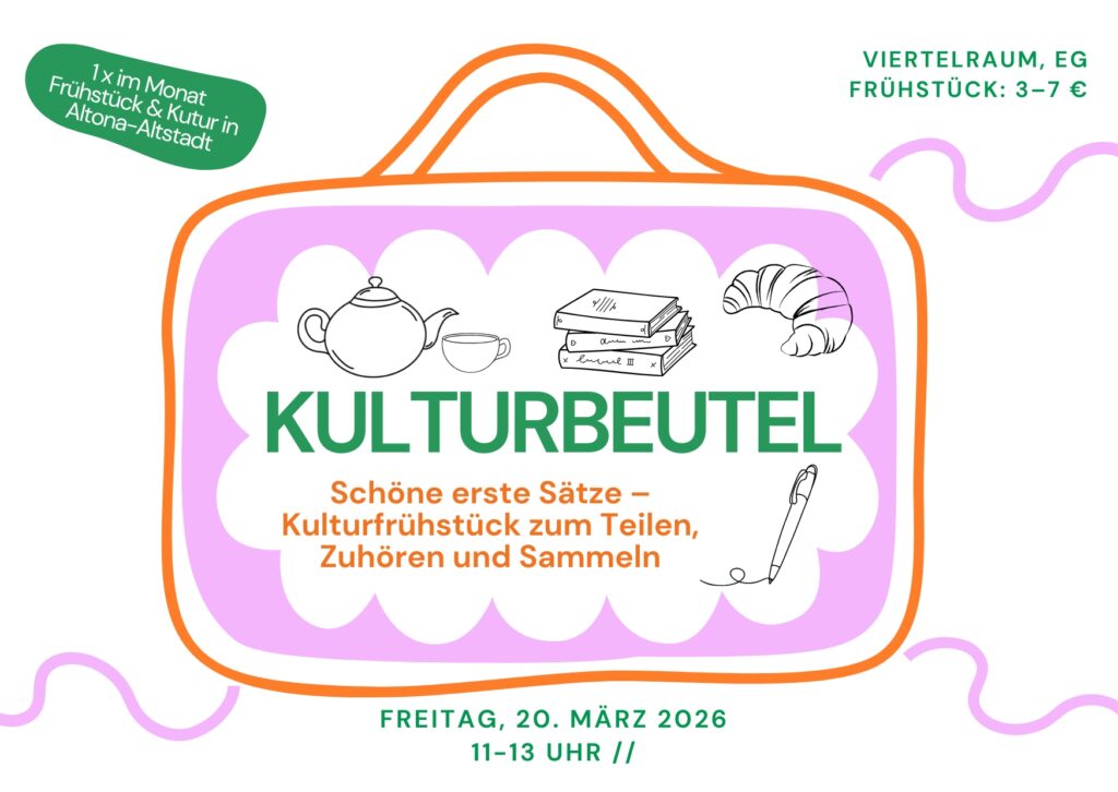 Wie immer erwartet euch ein gemütliches, offenes Frühstück in entspannter Atmosphäre. Der KulturBeutel findet einmal im Monat in der dunklen Jahreszeit statt und schafft Raum für Austausch, Begegnung und kleine kulturelle Entdeckungen – für die Nachbarschaft und alle, die darüber hinaus Lust haben vorbeizukommen.