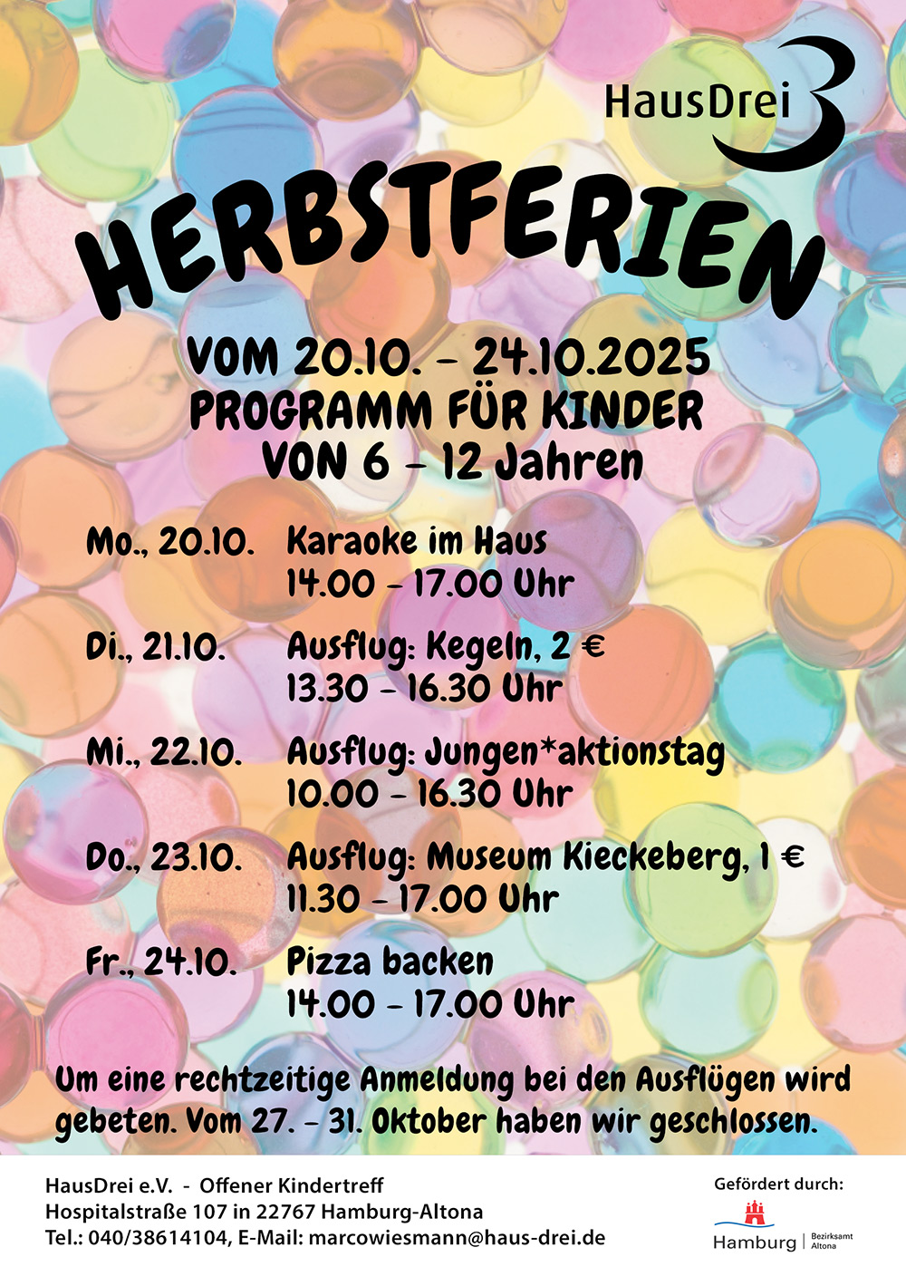 Bitte meldet euch rechtzeitig unter marcowiesmann@haus-drei.de an, da zumindest die Ausflüge in der Anzahl begrenzt sind.