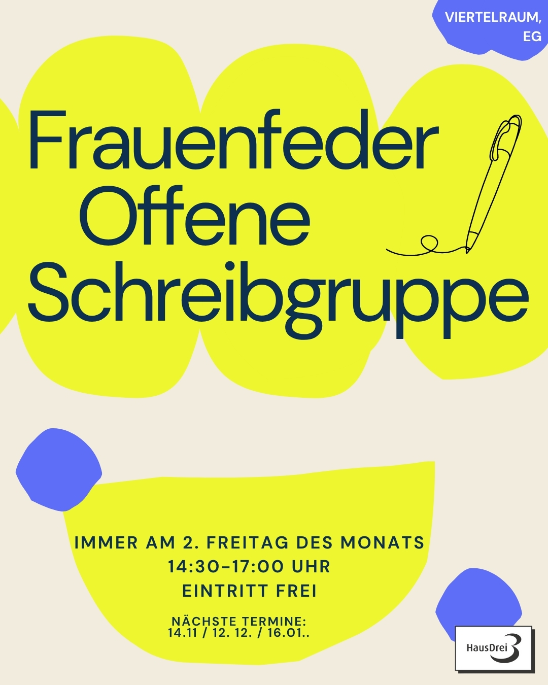 - Frauenfeder // Offene Schreibgruppe // 1x im Monat - Start: 14:30 - Ende: 17:00 - Ort: Viertelraum, EG (barrierefreie Toiletten vorhanden) - Frauengruppe, die sich gegenseitig beim Schreiben unterstützt. Gemeinsam werden Texte gelesen, Feedback gegeben und die regelmäßige Schreibpraxis gefördert. Jeden zweiten Freitag im Monat.