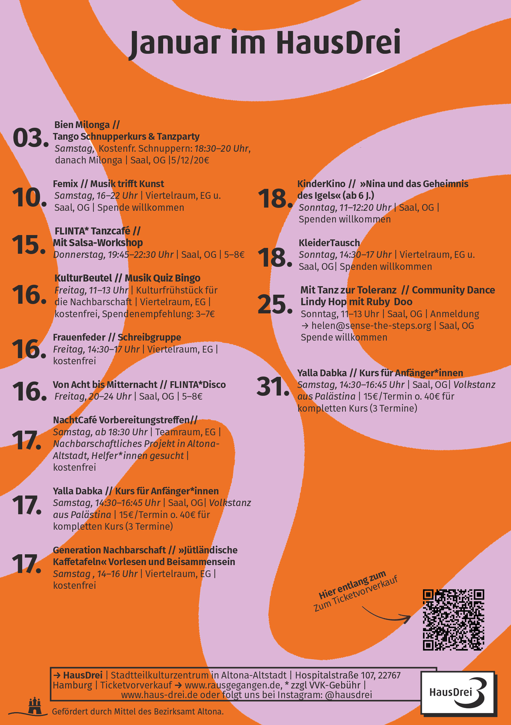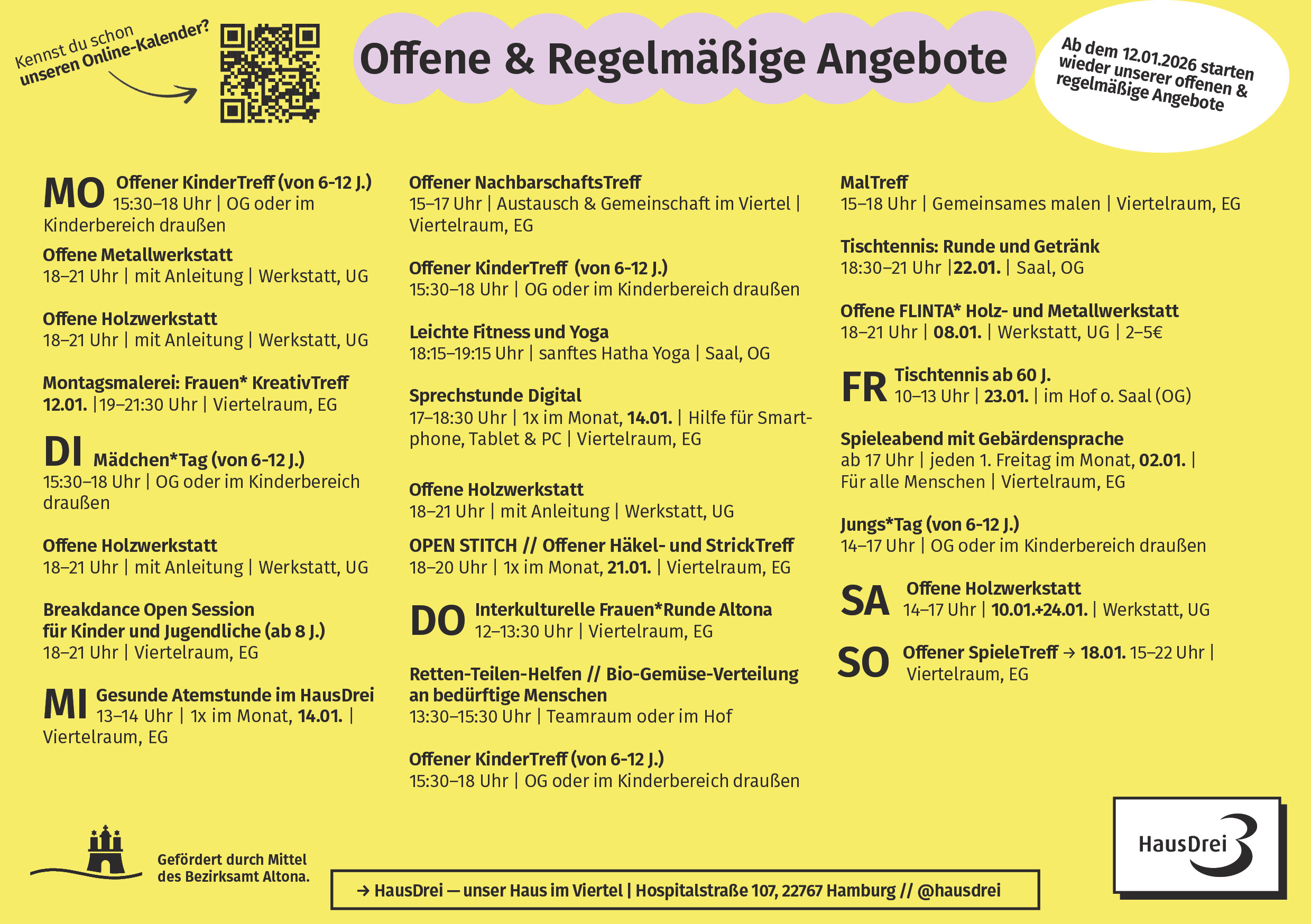 Ob Bewegung, Kultur oder einfach Zeit miteinander: Im Januar ist das HausDrei wieder offen für euch.